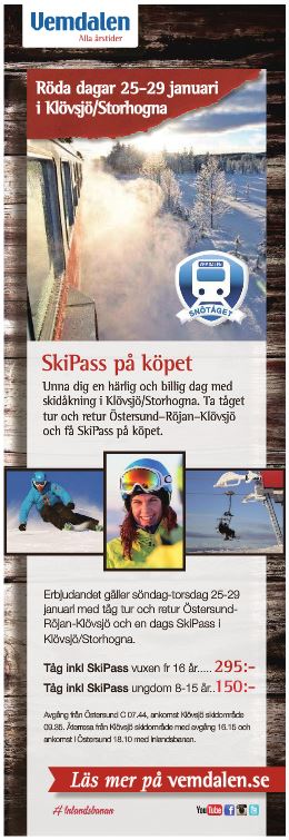På Röd Dag får du tåg, busstransfer och skipass för bara 295 kr. Erbjudandet gäller söndag 25/1 - torsdag 29/1 2015 i Klövsjö/Storhogna. Ingen förbokning behövs, biljett löses på tåget.